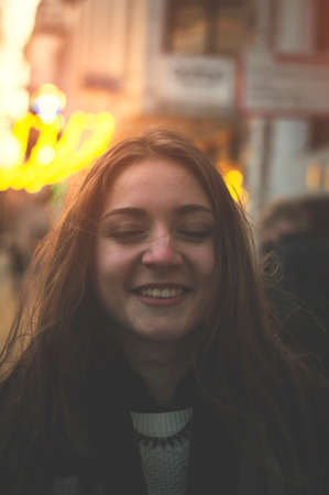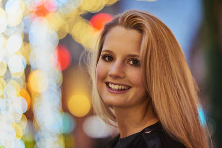 Beautiful young woman smiling and talking garlands of lights at city