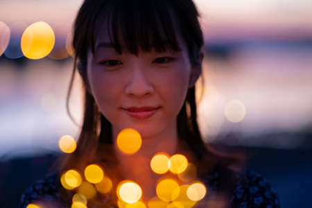 Asian young woman wrapping an illumination light with both hands