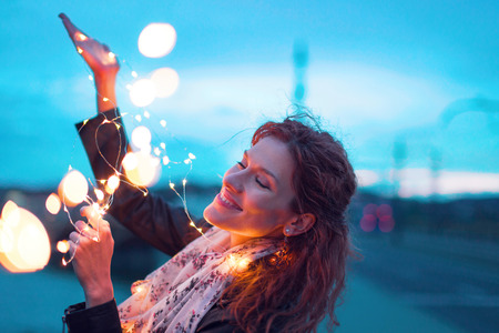Happy woman playing with fairy light garland at evening, outdoors, imagination
