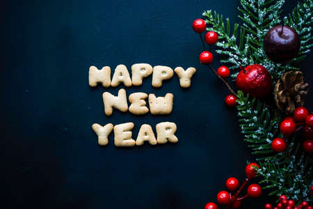 Christmas concept with cookies - letters Happy new year 2019 on dark background with copy space