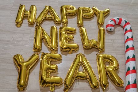 Happy New Year balloon golden text party. Inflated yellow lettering composition with festive balloons shaping the message in three rows words.