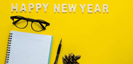 Symbol Happy new Year 2019 with notebook, black glasses on a yellow paper background .