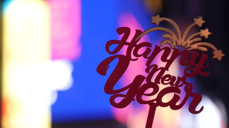 Happy New Year text sign on Times Square in New York City, United States. Illuminated screens during Christmas holidays in December on Manhattan. Festive celebration on Broadway in USA. Glowing lights