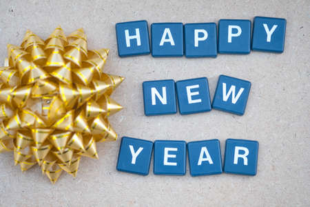 Text happy new years with gold bow against on wooden background. Concept background for happy new year