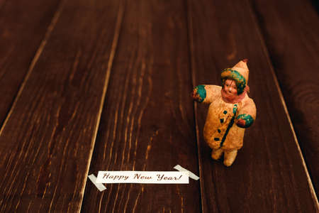 Christmas card on a dark wooden background with retro toy
