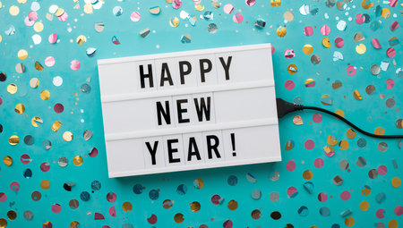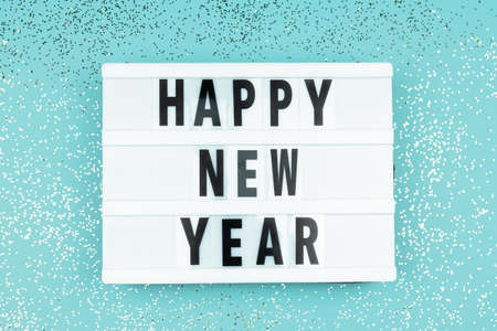 Happy new year light box with on blue background with scattered sparkling confetti