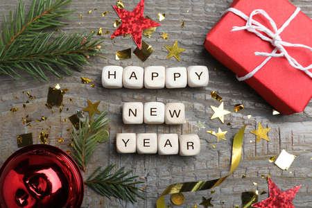 Phrase Happy New Year made of cubes and festive decor on wooden background, flat lay