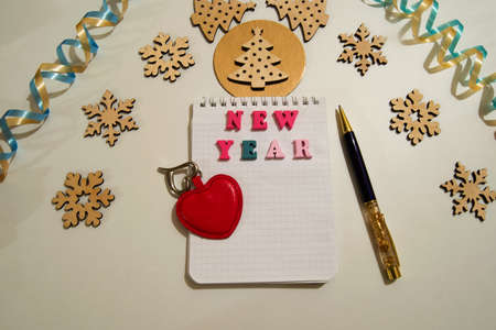 New Year words on wooden blocks. Inscription New year wooden word block.