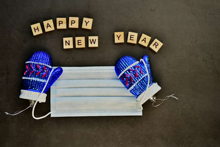 Protective medical mask with the inscription happy new year. Concept of gratitude and support to medical professionals. Concept of the celebration of Christmas in a new reality. Copy space.