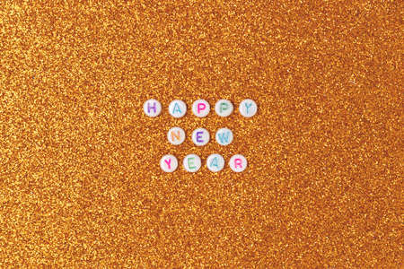 Happy New Year. Quote made of white round beads with colorful letters on a gold glittering background.