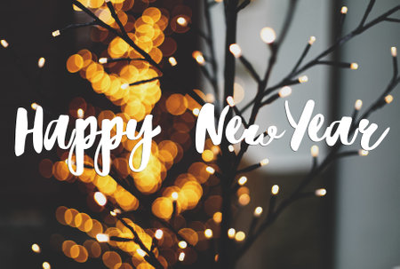 Happy New Year text handwritten on stylish illuminated tree with warm golden lights bokeh outdoor. Greeting card, modern seasons greetings