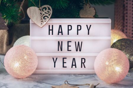 Lightbox with text HAPPY NEW YEAR with decorative Christmas trees. New year celebration