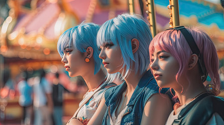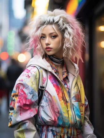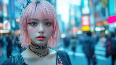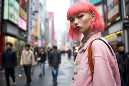 A woman with vibrant pink hair standing confidently in the midst of a bustling city street, A modern street style scene in Tokyo, AI Generated