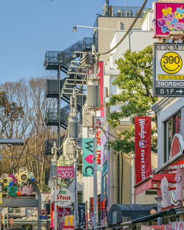 TOKYO, JAPAN, JANUARY - 2019 - Store billboards at famous takeshita street, harajuku district, tokyo, japan
