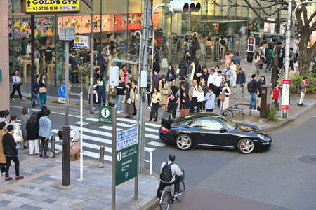 Tokyo, Japan - January 08, 2020: Tourists and Local People walking on the Beautiful Tokyo street among passing Cars in the Night time