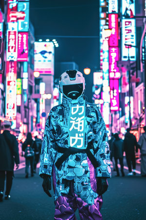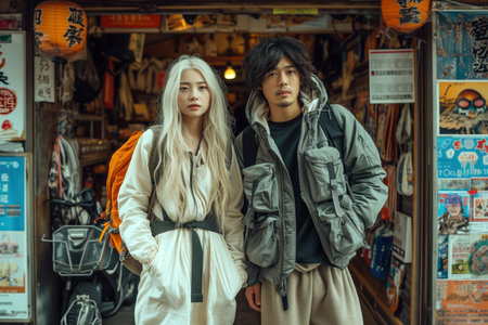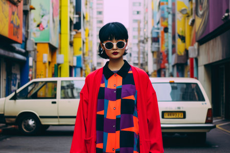 Young Japanese woman wearing fashionable, unique clothing, strolling through Shibuya, the heart of Tokyo vibrant street culture.