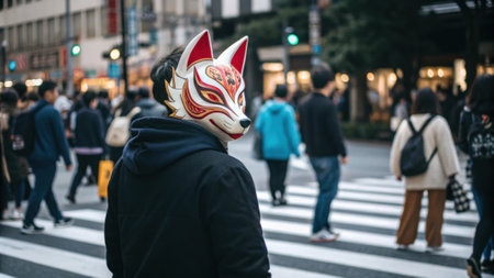 A busy crosswalk generates movement while the wolf mask draws attention with its bold design..