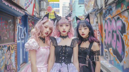 A group of Korean girls showcasing an eclectic mix of pastel goth and kawaii fashion, standing confidently on a vibrant, graffiti-filled street.