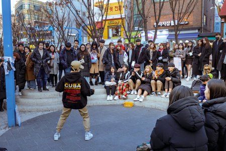 Seoul, South Korea - March 2, 2018 : Hongdae (Hongik University) shopping street, Unidentified musician shows tourist on the street.