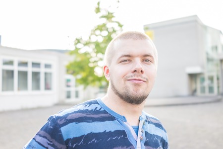 Lifestyle portrait of a young Caucasian man in casual wear on a blurred background of the urban environment.