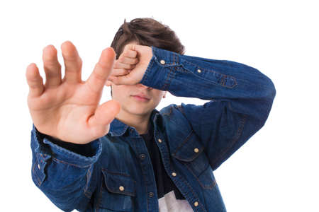 Frustrated scared young teen girl closed eyes with hands and showing stop gesture dont want to see disgraceful content