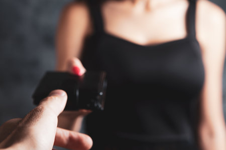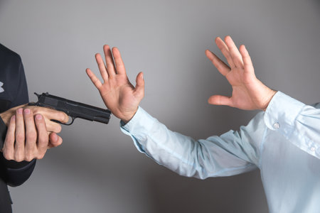 Pistol: transfer of a weapon, a pistol from hand to hand, against a light background.