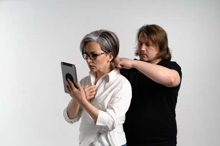 The stylist man adjusts the presenters or bloggers costume before going on TV, an adult woman reads the text using a digital tablet isolated on white background.