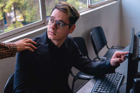Boss touching shoulder of a young female employee in office at workplace. She is uncomfortable and afraid of sexual inappropriate abuse from a colleague. Concept of sexual harassment in the workplace