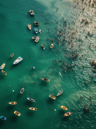 Generative AI : ITHAKI GREECE AUGUST 9 2018 Aerial view of people on ferry diving into sea Ithaki island Greece