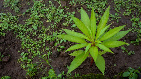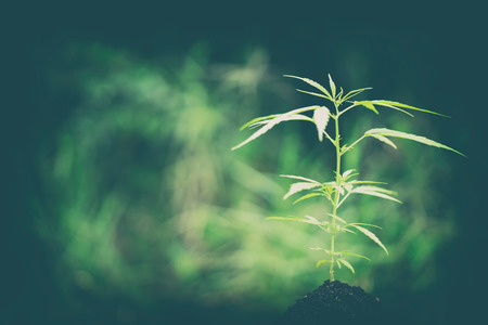 A small plant of cannabis seedlings at the stage of vegetation planted in the ground in the sun, a beautiful background, eceptions of cultivation in an indoor marijuana for medical purposes
