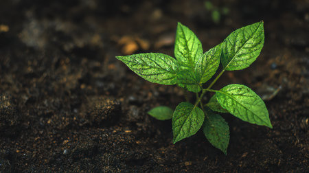 A fresh sprout emerges from fertile earth, its bright leaves contrasting with the dark, nutrient-rich ground, embodying freshness, vitality, and new beginnings in na