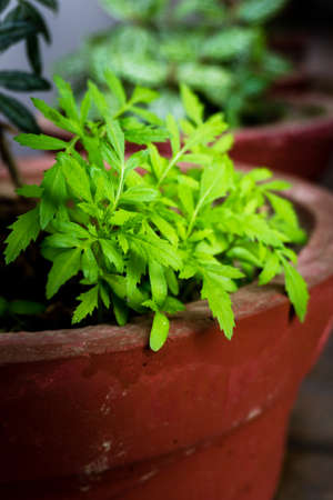 A beautiful bright green marigold plant leaves growing in a earthen flower pot in an Indian household.