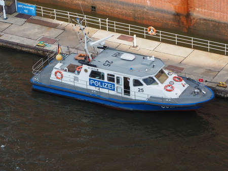 HAMBURG, GERMANY - CIRCA MAY 2017: Polizei (meaning Police) boat in Hamburg HafenCity canal