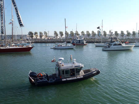 Oct 12, 2019 San Francisco / CA / USA - San Francisco Police Department vessel stopped next to a cruising ship; San Francisco Fleet Week event