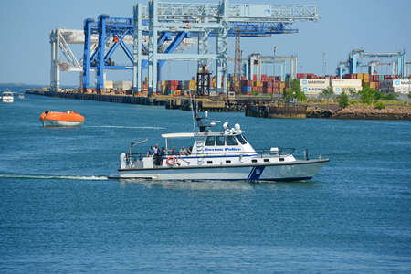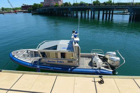 Boston Police boat at Boston Cruise Port in Seaport District, city of Boston, Massachusetts MA, USA.