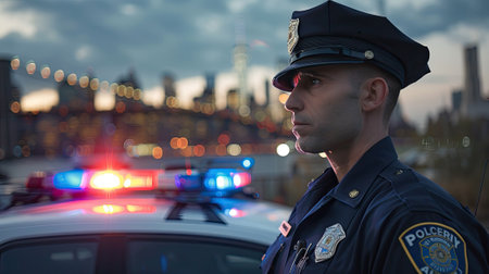 A police officer in uniform, standing in front of a patrol car, with a cityscape in the background and space for text, --ar 16:9 Job ID: 9b2aad34-84ba-43c2-9c74-36474031976c
