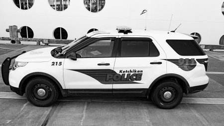 Ketchikan, Alaska, USA - July 26, 2019: 2020 Ford Explorer police car. Police car SUV of Ford Explorer. Ford Explorer outdoor. Police patrol car parked outdoor. Ford Explorer, side view
