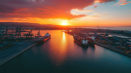 A large container ship is seen docking at a bustling harbor, surrounded by towering cranes and various maritime structures beneath a clear sky and calm waters.