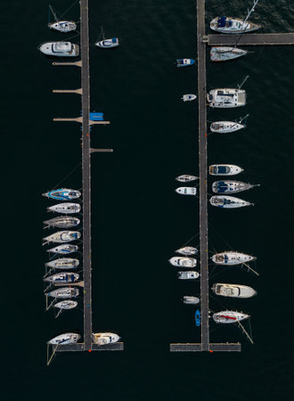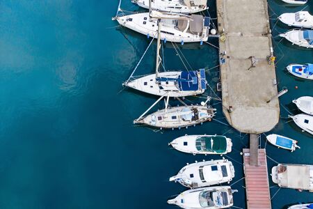 Top view of luxury yachts in the harbor, aerial shoot with drone. Concept of tourism and recreation