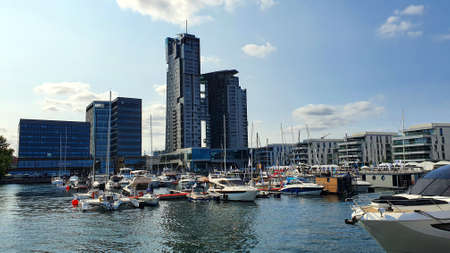 Gdynia, Poland - July 18, 2021: Motorboats and boats in a new modern marina in Gdynia, Poland.