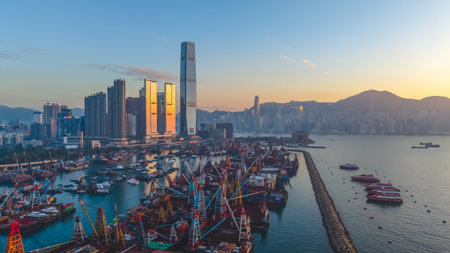 Generative AI : Aerial View of the Tower and financial district with skyscrapers at sunset along the waterfront bay in Hong Kong Island downtown Central and Western District Hong K