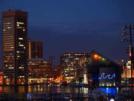 BALTIMORE, MD - February 11, 2015: The World Trade Center, the National Aquarium, and other buildings light up the night sky around Baltimore's famous Inner Harbor in Baltimore, MD.