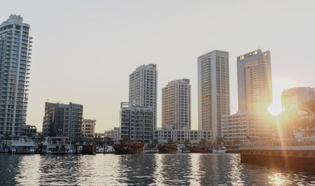 Dubai, United Arab Emirates, Middle East - December, 27, 2023 - luxury lifestyle hotels skyscrapers and yachts in Dubai Marina