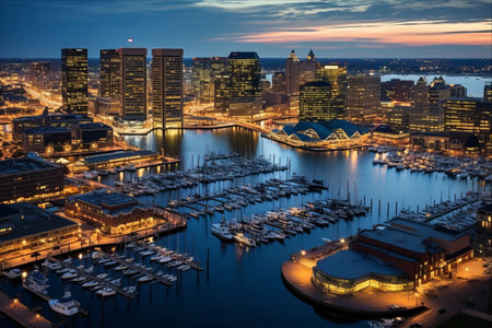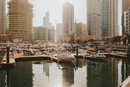 A breathtaking view of a marina at sunset, showcasing luxury yachts and a vibrant city skyline reflecting on calm waters, embodying urban tranquility.