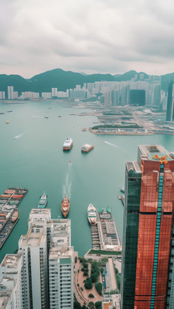 Aerial shot of a harbor with ships and tall buildings in the background, leaving space for copy.
