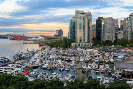 Cityscape of downtown Vancouver with its marina and buildings.
