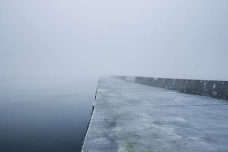 Panoramic view of Baltic sea from sandy shore. Promenade to the lighthouse, breakwaters. Thick white fog, mist. Waves, water splashes, long exposure. Seascape. Picturesque monochrome scenery