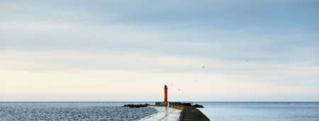 View of the Mediterranean sea from the jetty in the harbor of Pesaro with a red lighthouse (Pesaro, Italy, Europe)