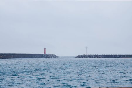 Jetty with towers and buoys. Beautiful seascape, copy space. Breakwater for protect ships at shipyard from waves
