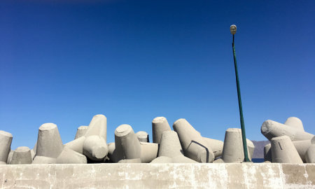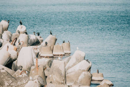 Pile of concrete blocks on the seashore. Abstract background.